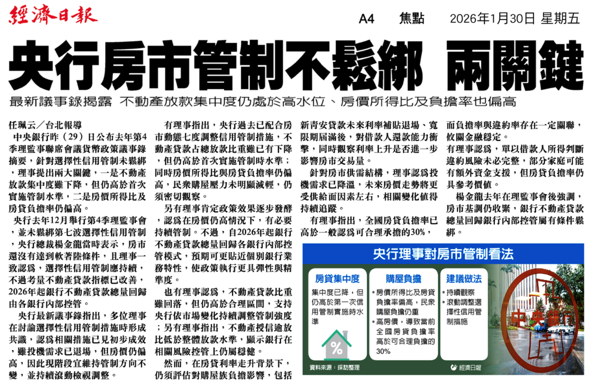 剪報導讀|央行房市管制不鬆綁 × 貸款環境偏緊