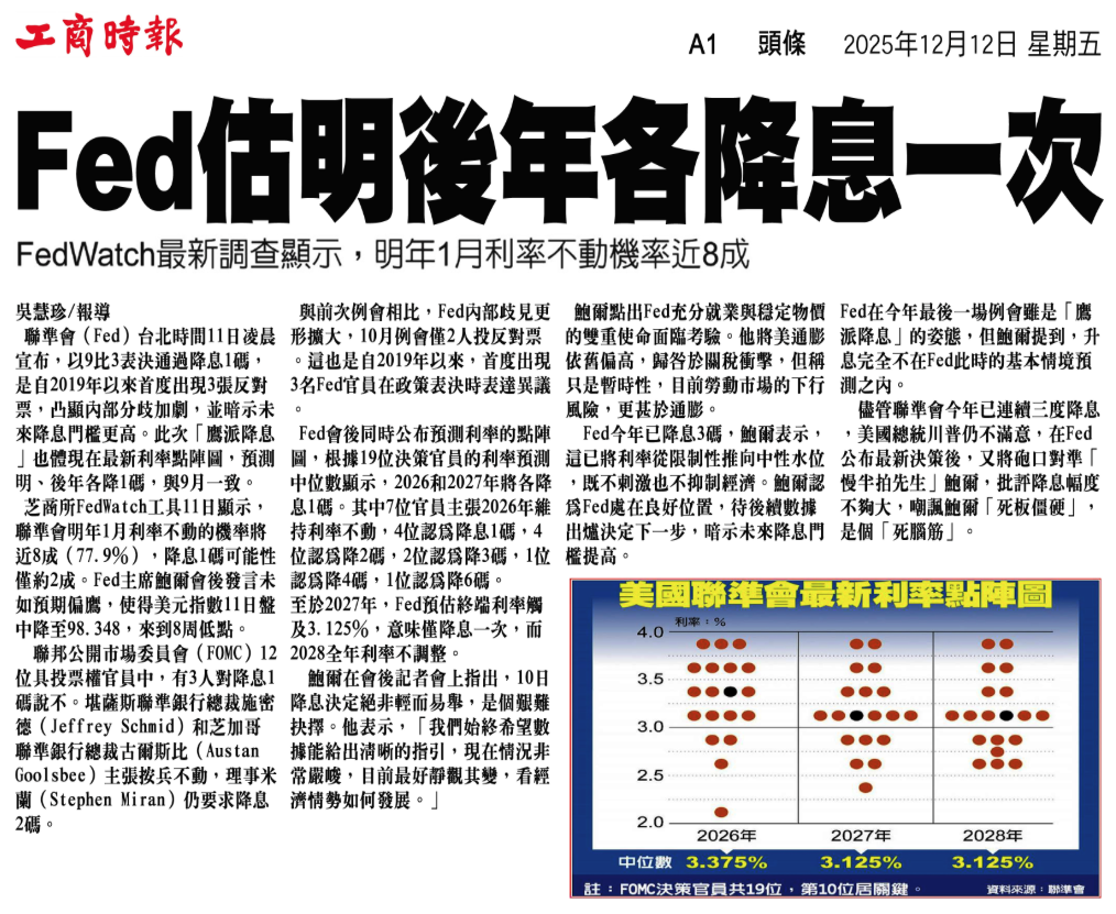- 這次會議降息 1 碼,但點陣圖顯示:2026、2027 年各再降一次後就停,屬於「慢速降息」。