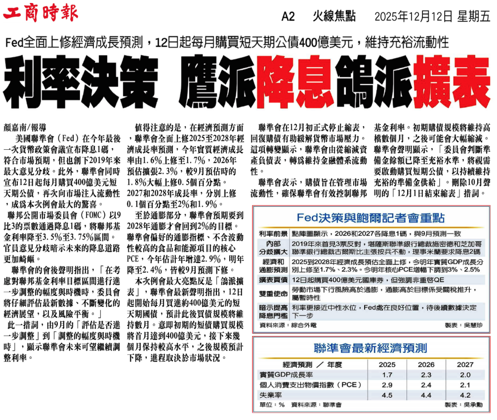 最新一次 FOMC 宣布降息 1 碼,同時啟動每月購買 400 億美元短天期公債,但利率點陣圖卻顯示: 2026、2027 年僅各降息一次,之後利率維持在「略高但可接受」區間。 剪報三篇從不同角度看同一件事:政策利率進入「高位盤整」後段,而資金面卻開始慢慢寬鬆。 以下整理成一篇給投資人、壽險保戶與理專、保經人都看得懂的專業解析。