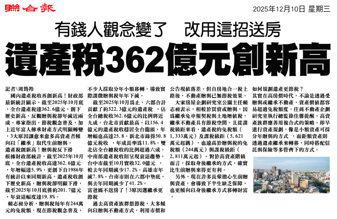 剪報提到:遺產稅收創新高、富裕族群不再單純用「贈與房產」方式,而是更重視傳承成本 × 資產彈性 × 稅務風險。