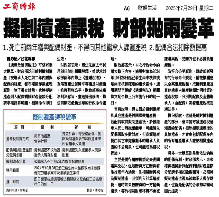 新制會把這些金額列為「擬制遺產」,但由配偶專屬稅單負擔其占比分攤的那一部分。
