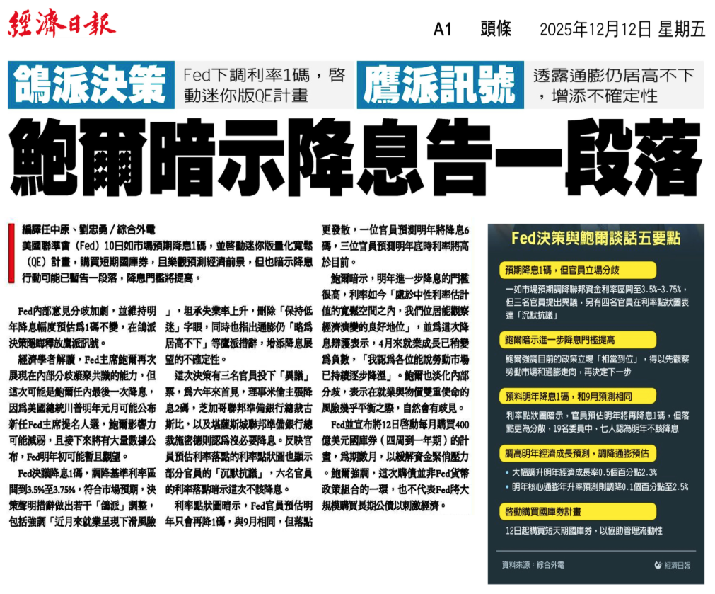 最新一次 FOMC 宣布降息 1 碼,同時啟動每月購買 400 億美元短天期公債,但利率點陣圖卻顯示: 2026、2027 年僅各降息一次,之後利率維持在「略高但可接受」區間。 剪報三篇從不同角度看同一件事:政策利率進入「高位盤整」後段,而資金面卻開始慢慢寬鬆。 以下整理成一篇給投資人、壽險保戶與理專、保經人都看得懂的專業解析。