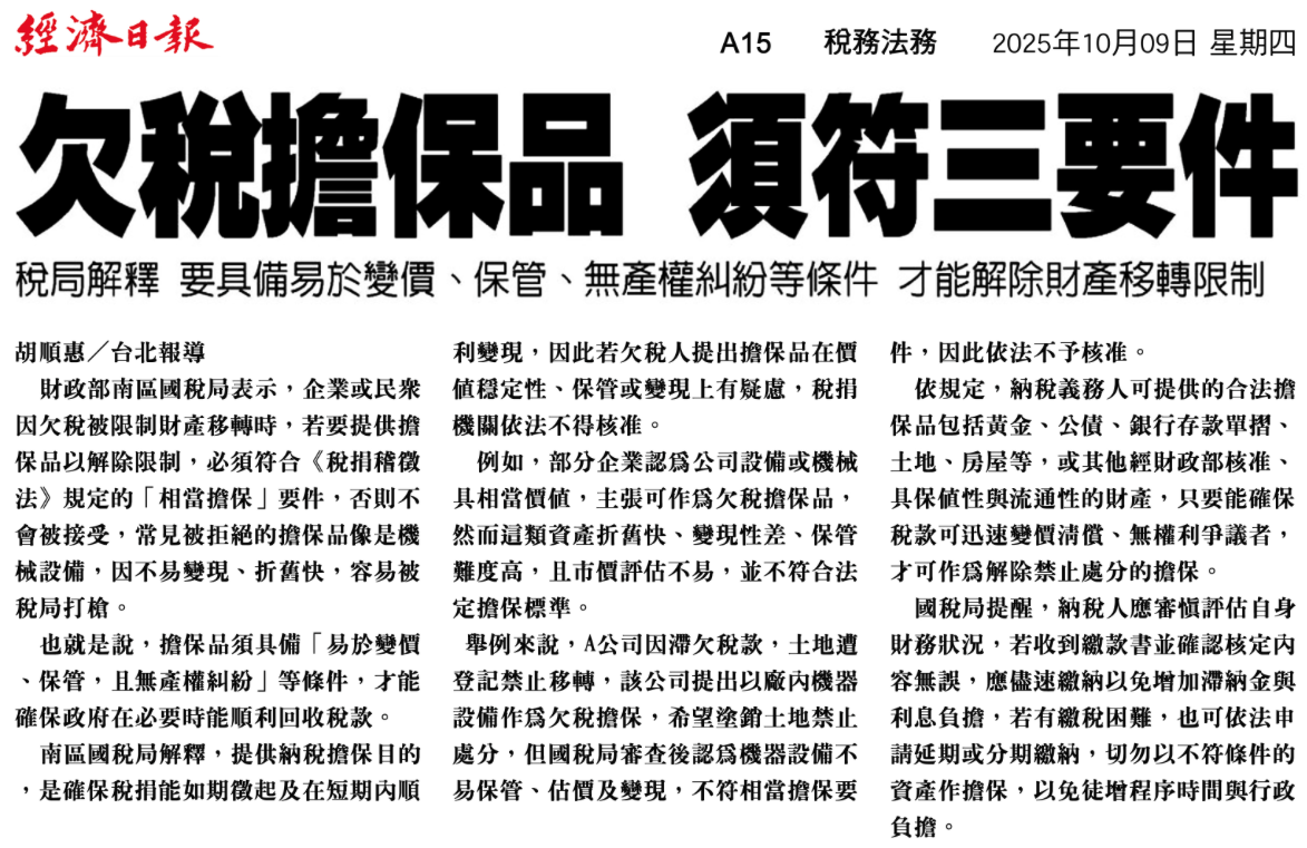 - 南區國稅局新聞:相當擔保三要件=易變價、保管、無產權紛爭;機器設備等不符要件者不予核准。連結