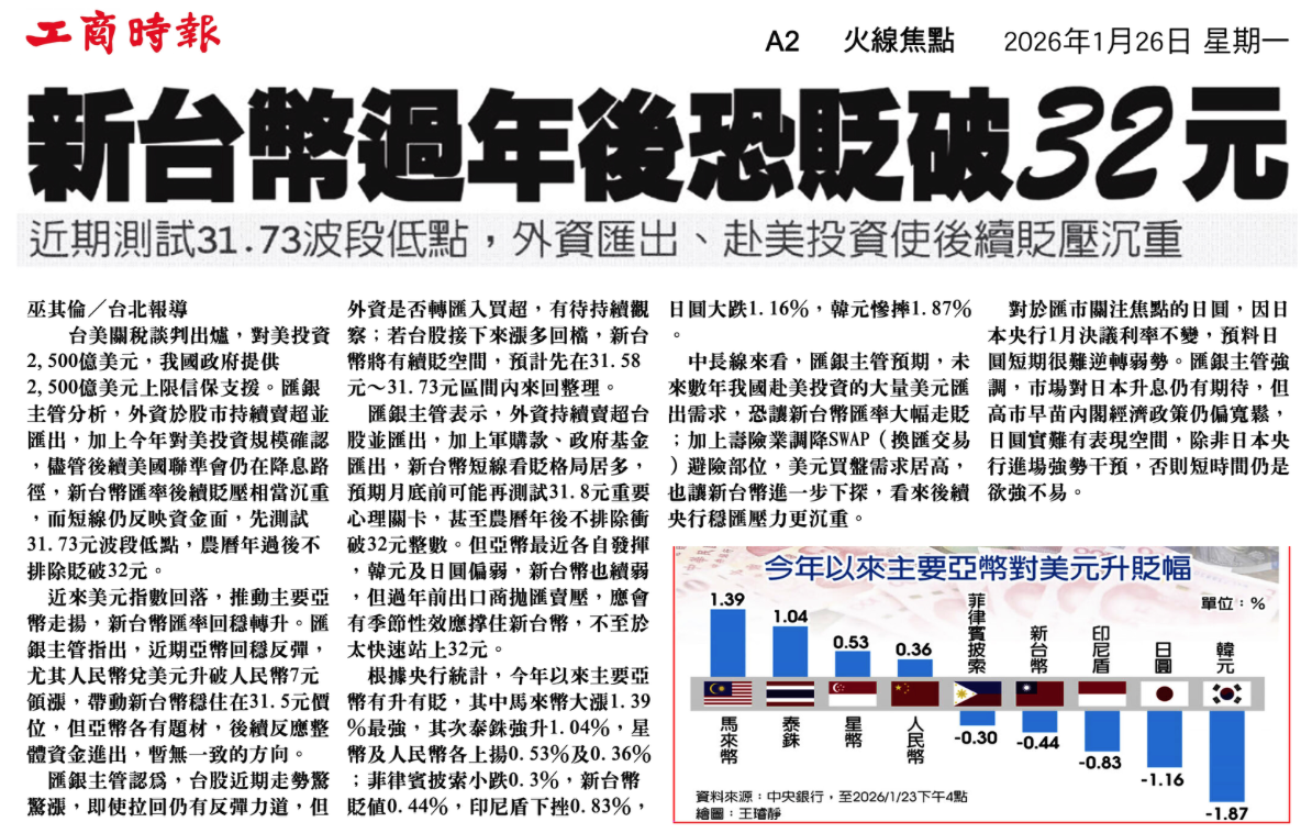 - 同一版面也列出「今年以來主要亞幣對美元升貶幅」,可以看到:新台幣與日圓、韓元一樣,整體偏弱勢。