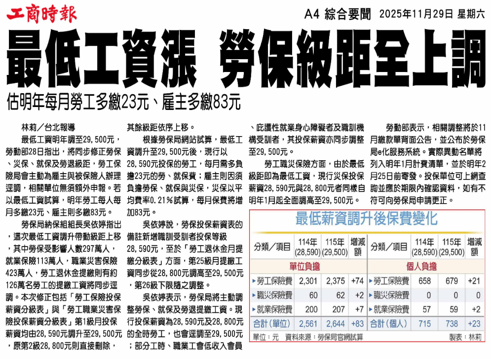 - 最低工資自明年起調升至29,500 元,連動勞工保險等投保薪資級距全面上調。